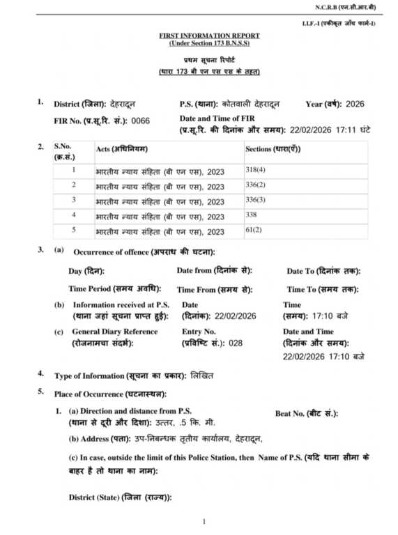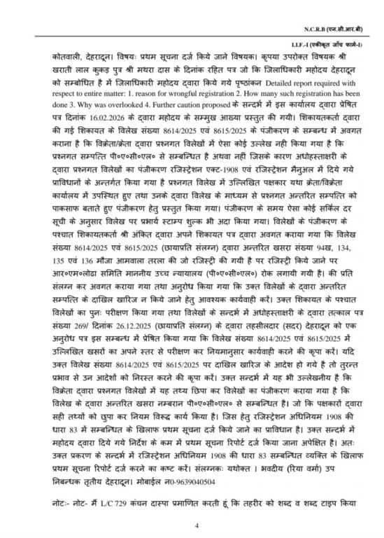 देहरादून: 24 फरवरी 2026: जनपद में न्यायालय द्वारा प्रतिबंधित भूमि के अवैध क्रय-विक्रय से जुड़े गंभीर फर्जीवाड़े के मामले में जिलाधिकारी सविन बंसल ने कड़ा संज्ञान लेते हुए क्रेता एवं विक्रेता के विरुद्ध थाना शहर कोतवाली में एफआईआर दर्ज कराने के निर्देश दिए हैं। राज्य की सरकारी भूमि पर गिद्ध नजर गढाये बैठे भू-माफिया बिल्डर्स पर जिला प्रशासन कड़े प्रहार करने के मूड मेें है. चंडीगढ पंजाब बाहरी लोग राज्य की प्रतिबन्धित भूमि जिनपर न्यायालय द्वारा क्रय-व्रिकय पर रोक लगा रखी है ऐसी भूमि पर भू-माफियाओं की नजर है, ज़िला प्रशासन के अनुसार ऐसी भूमि को कूटरचित दस्तावेज से जमीन बेचने का मामला संज्ञान में आया है। जिस पर जिलाधिकारी ने एक्शन लेते हुए मुकदमा दर्ज कराया है तथा अधिकारियों को निर्देशित किया कि इस तरह के अन्य प्रकरणों पर कार्यवाही की जाए। ऐसे प्रकरणों पर जिला प्रशासन कड़ा एक्शन लेने के मूड में है।