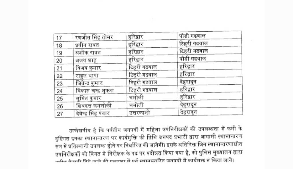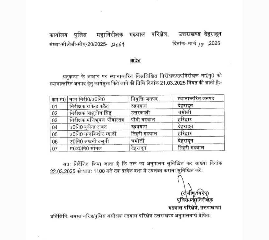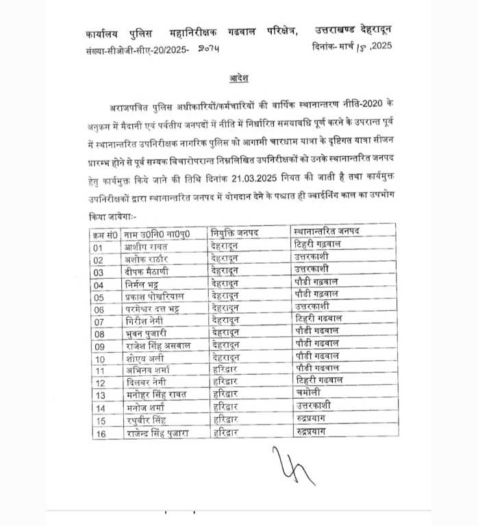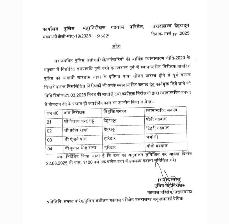 देहरादून: आखिरकार एक बार फिर गढ़वाल रेंज द्वारा मैदानी जिलों में डटे 07 इंस्पेक्टर्स और 31 दरोगाओं को पहाड़ चढ़ाने आदेश जारी किये गए हैं.. जारी आदेश के मुताबिक आगामी 21 मार्च 2025 तक ट्रांसफर किये गए इंस्पेक्टर और दारोगाओं को वर्तमान तैनाती से कार्य मुक्त करने की तिथि नियत की गई है..