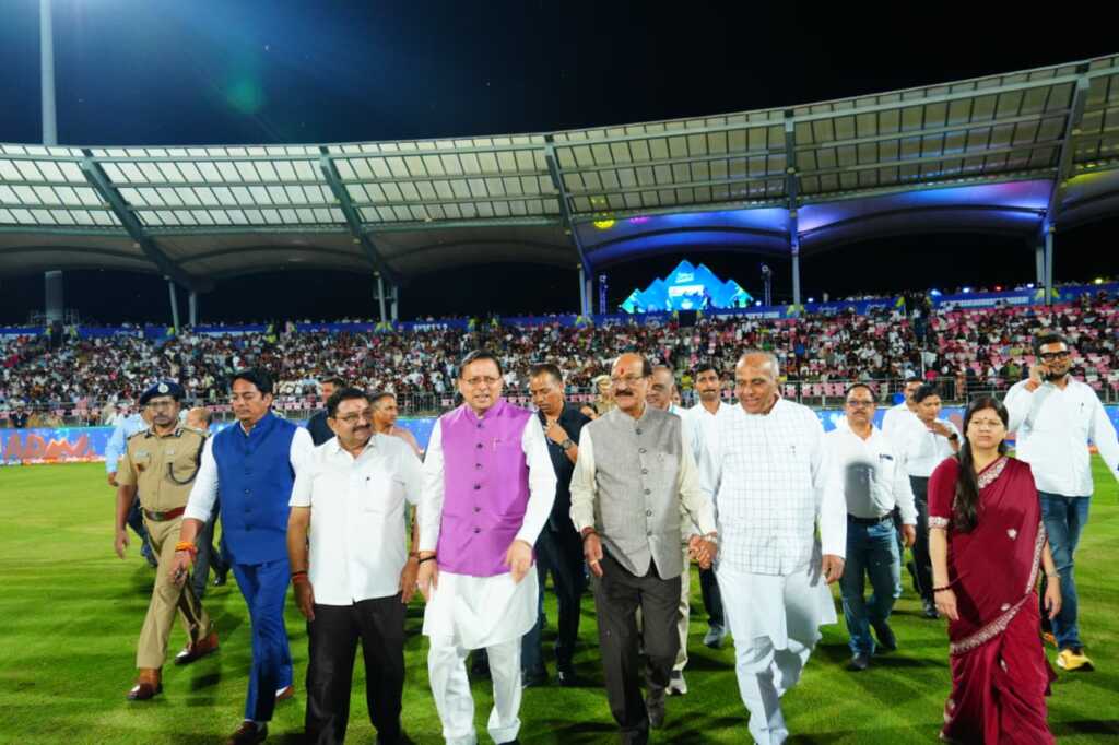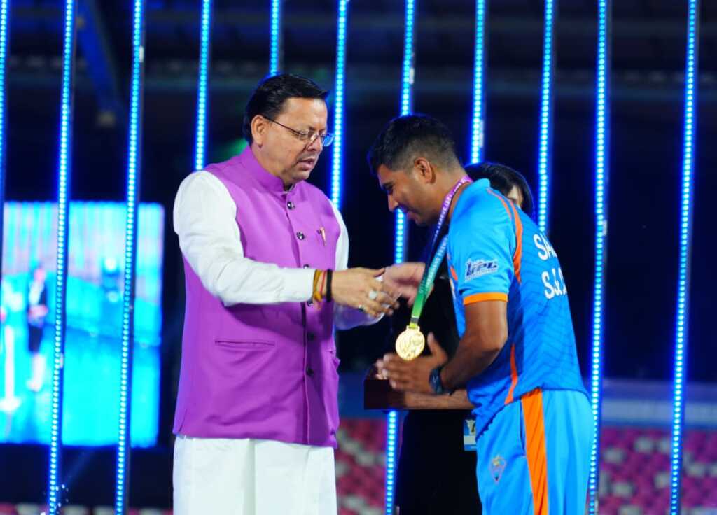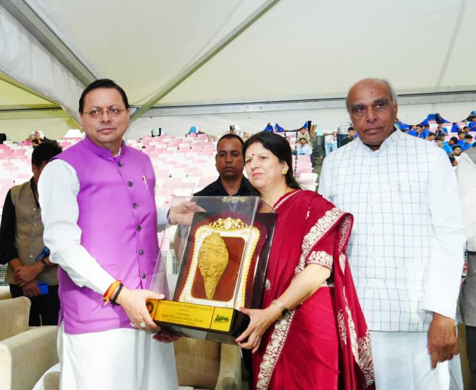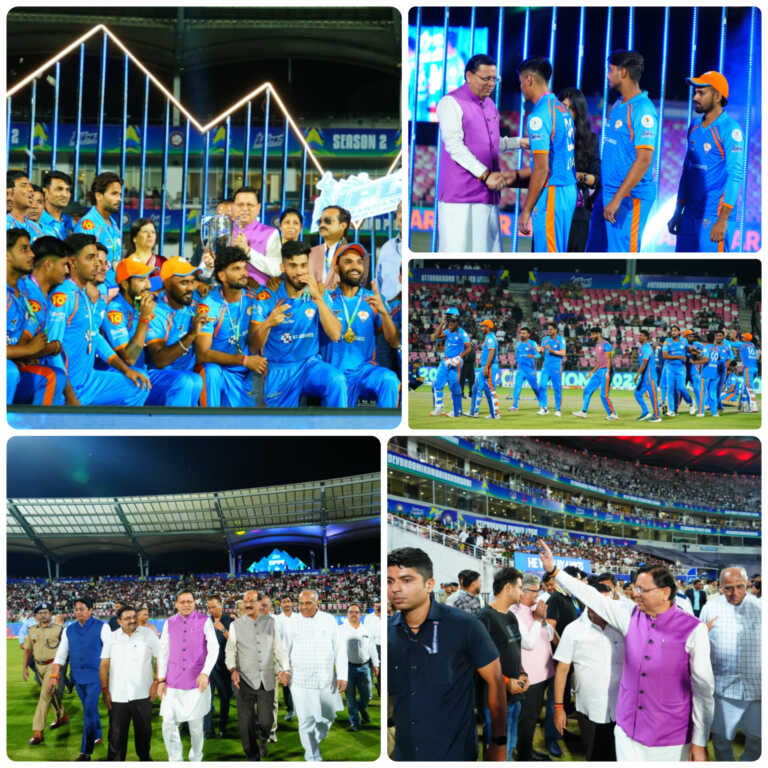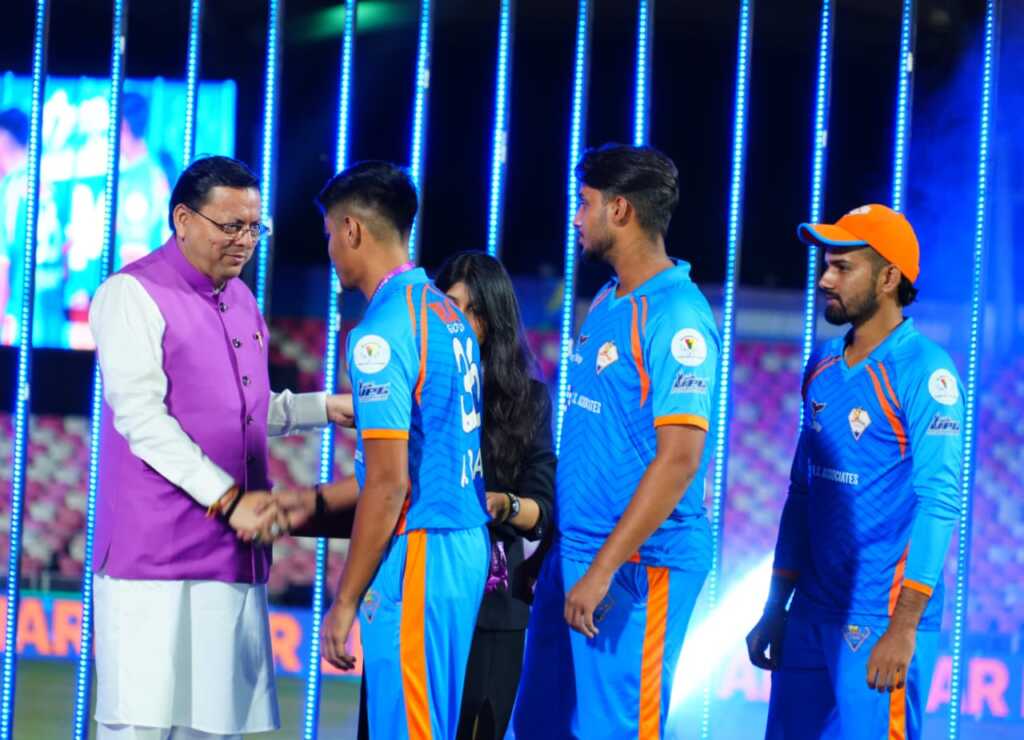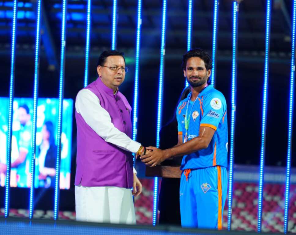 देहरादून: मुख्यमंत्री पुष्कर सिंह धामी ने क्रिकेट एसोसिएशन ऑफ उत्तराखंड की द्वारा राजीव गाँधी इंटरनेशनल स्टेडियम रायपुर देहरादून में आयोजित उत्तराखंड प्रीमियर लीग 2025 के समापन समारोह में प्रतिभाग किया. हरिद्वार एलमास उत्तराखंड प्रीमियर लीग 2025 चेपियनशिप का विजेता रहा..इस अवसर सभी खिलाड़ियों एंव आयोजन समिति के पदाधिकारियों का स्वागत व अभिनन्दन करते हुए मुख्यमंत्री पुष्कर सिंह धामी ने उत्कृष्ट प्रदर्शन द्वारा उत्तराखंड प्रीमियर लीग चैंपियनशिप को जीतने वाली टीम के सभी खिलाड़ियों को बधाई दी..